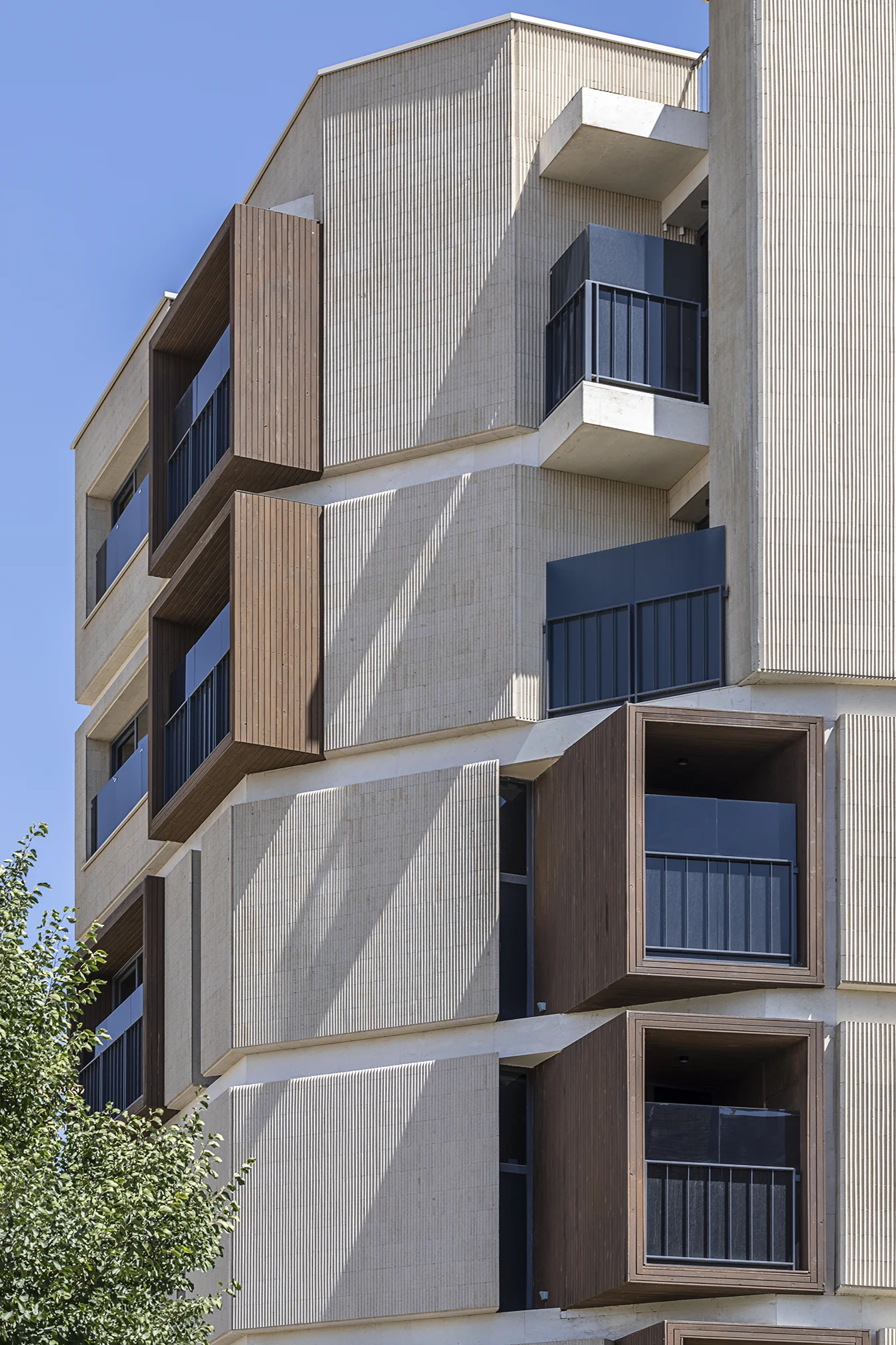 پروژه مسکونی خیابان مهر در اصفهان، تلاشی آگاهانه برای ایجاد تعادل میان اصالت تاریخی و نیازهای زندگی معاصر است که در قالب یک پوسته سهبعدی و پویا شکل گرفته. نمای آجری سفید با چرخش ۴۵ درجهای آجرها، بافتی زنده و متغیر ایجاد میکند که در تعامل با نور خورشید، بازی ظریفی از نور و سایه را به نمایش میگذارد. این ریتم پویا در کنار باکسهای چوبی تراسها، ضمن افزایش عمق بصری نما، هویتی تندیسگونه و در عین حال صمیمی به بنا بخشیده و محرمیت ساکنان را تقویت میکند.